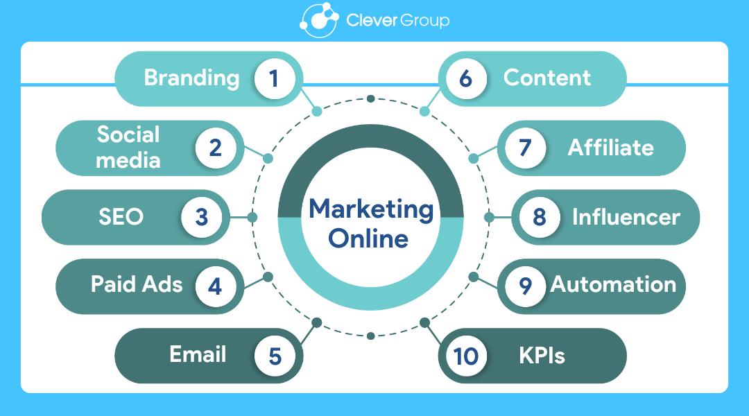 Marketing online là việc sử dụng các kênh trực tuyến như website, mạng xã hội, email hay công cụ tìm kiếm để quảng bá sản phẩm, dịch vụ và xây dựng thương hiệu.