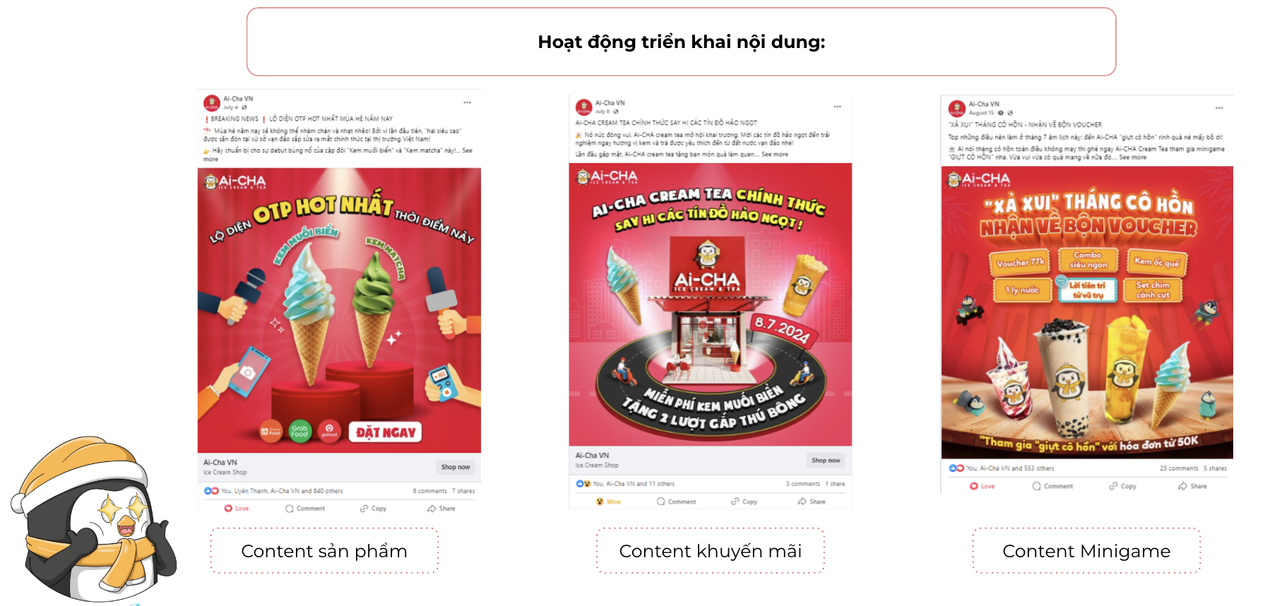 - Content sản phẩm: Nội dung giới thiệu các sản phẩm nổi bật của AI-CHA CREAM & TEA, nhấn mạnh vào các loại kem độc đáo như “kem muối biển” và “kem matcha”. Điều này giúp người tiêu dùng nhận diện sản phẩm đặc trưng của thương hiệu, tạo sự khác biệt so với các đối thủ.