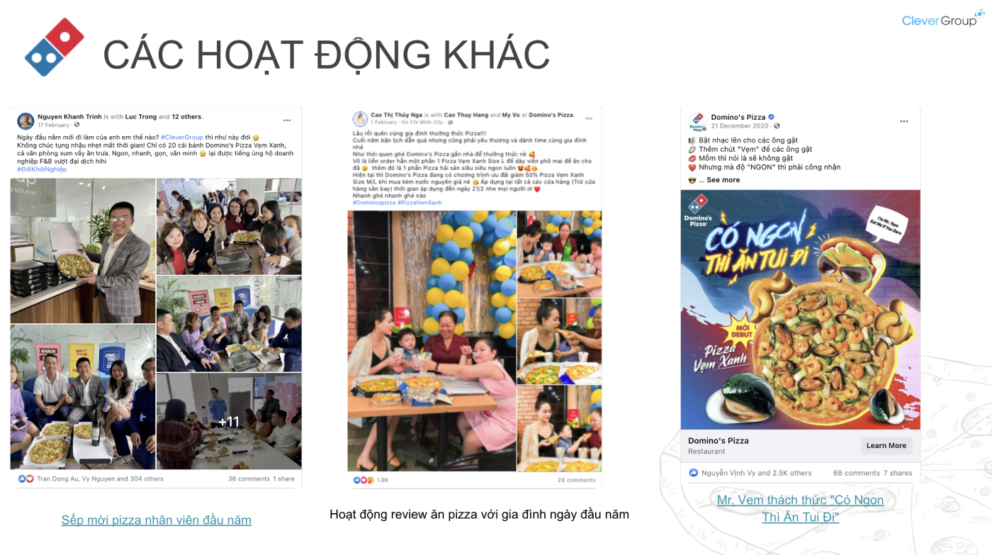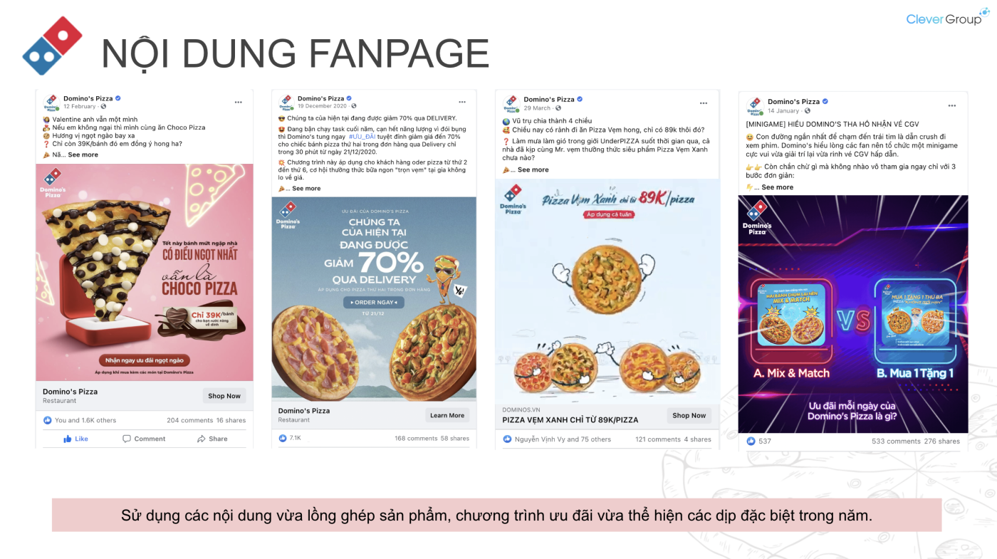 Fanpage Facebook: CleverAds đã tối ưu hóa fanpage của Domino’s với các bài viết hấp dẫn, từ hình ảnh bắt mắt đến các chương trình khuyến mãi, nhằm thu hút sự chú ý và tương tác từ cộng đồng.