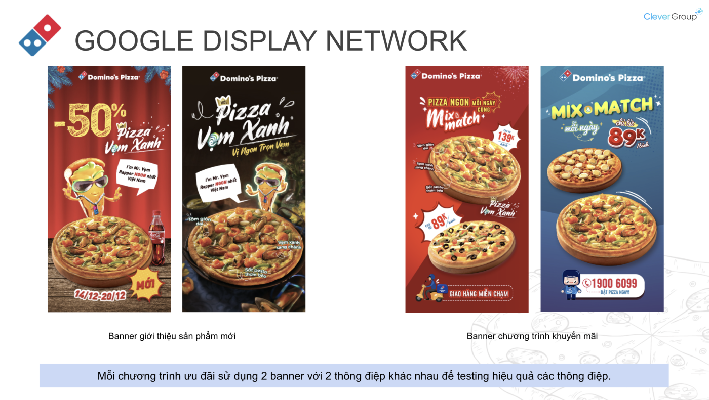 CleverAds đã tận dụng Google Display Network với các banner quảng cáo đa dạng, nhắm mục tiêu chính xác đến khách hàng tiềm năng. Kết hợp giữa các chương trình khuyến mãi và thông điệp về sản phẩm đã giúp tăng đáng kể lượng truy cập vào website của Domino’s Pizza.