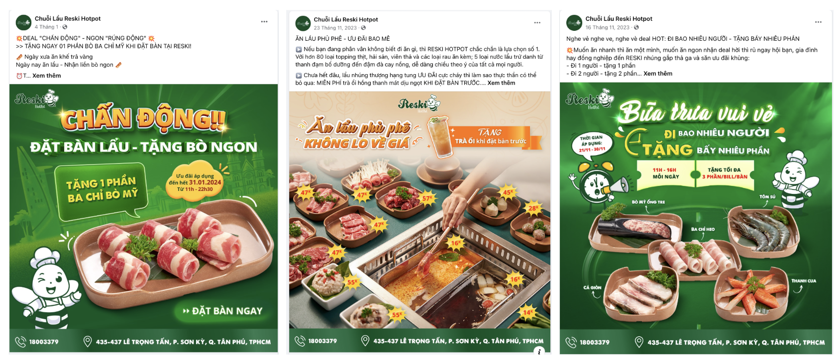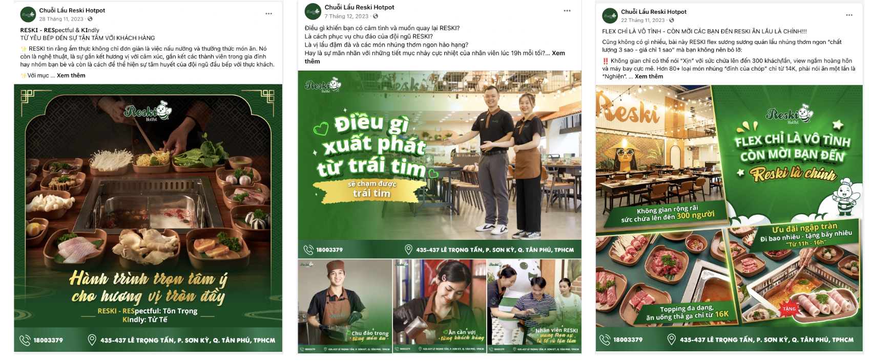 - Nội dung về thương hiệu và món ăn: Giới thiệu về phong cách lẩu đặc biệt của Reski Hotpot và sự tươi ngon của nguyên liệu. => truyền tải thông điệp của Reski Hotpot.
