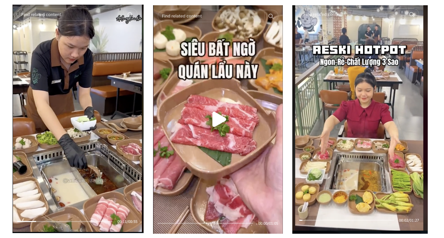 - Nội dung video: Các video tập trung vào trải nghiệm của khách hàng tại Reski Hotpot, các món ăn như thịt bò, rau và nước lẩu được bày biện cẩn thận.